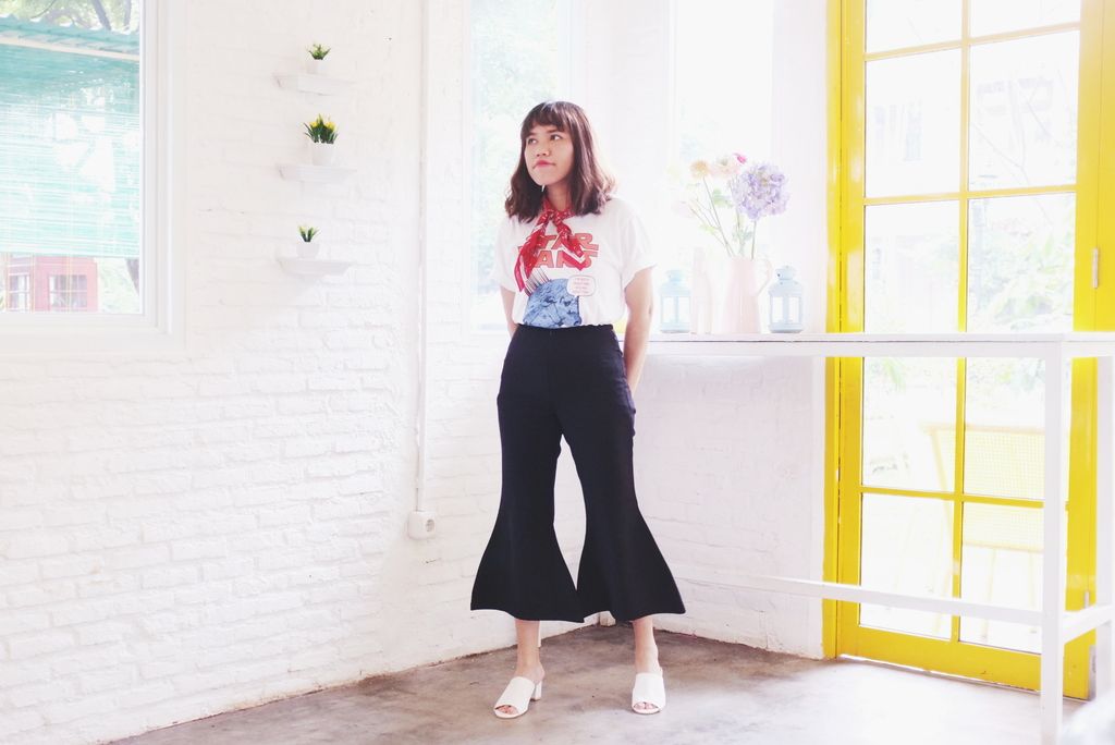 Star Wars tee - Unqlo | flare pants - Swankki | denim jacket - Pasar Melati (Medan thrift store) | white mules - PICNIC